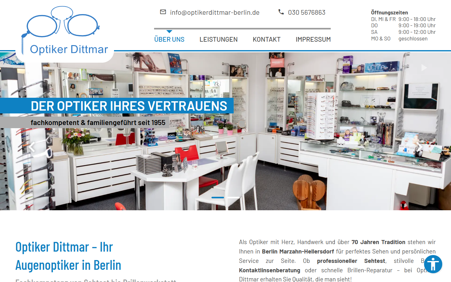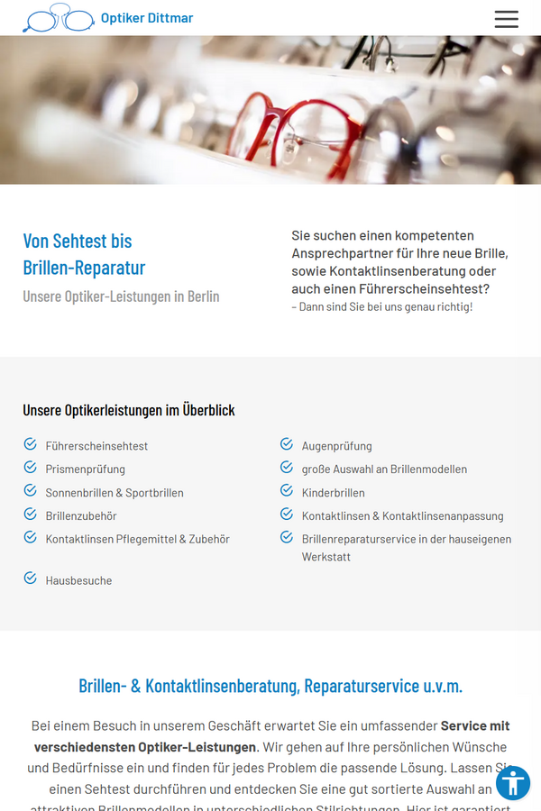 Für Optiker Dittmar haben wir eine moderne, responsive Webseite entwickelt, die die Kompetenz des Familienbetriebs digital sichtbar macht. Die Seite präsentiert übersichtlich Leistungen wie Sehtests, Brillen, Kontaktlinsen und Reparaturservice und erleichtert Interessenten die Kontaktaufnahme. Durch gezieltes Online-Marketing, lokale SEO und mobile Optimierung wird die Sichtbarkeit in Berlin und Umgebung erhöht. Ziel war eine nutzerfreundliche, vertrauensvolle Webpräsenz, die Kunden anspricht und Vertrauen aufbaut.