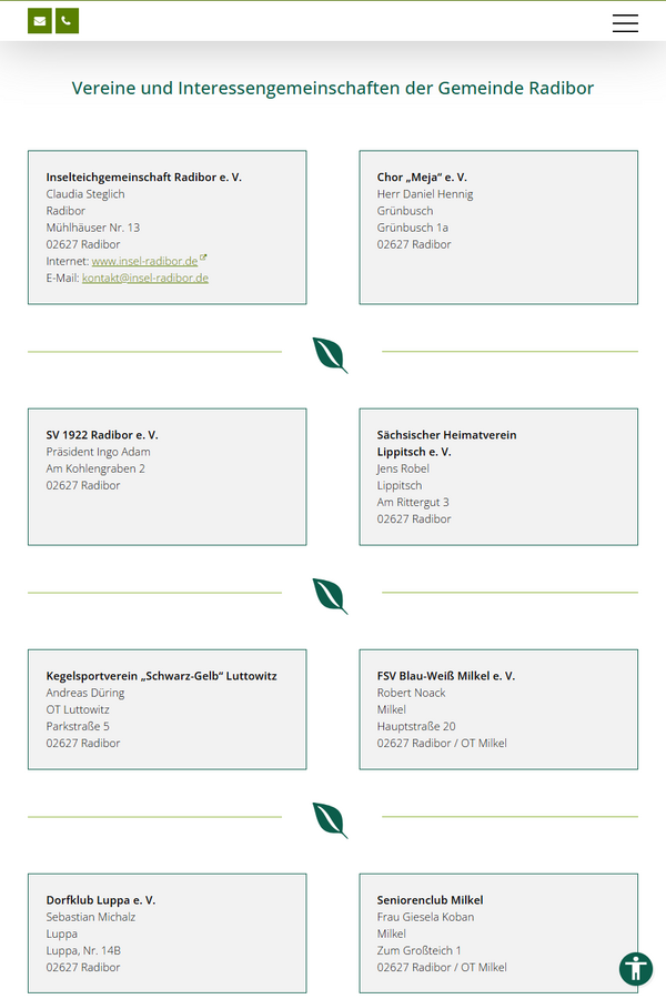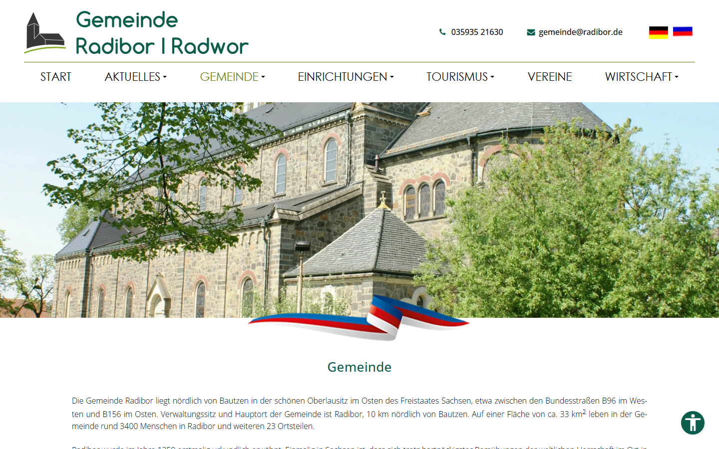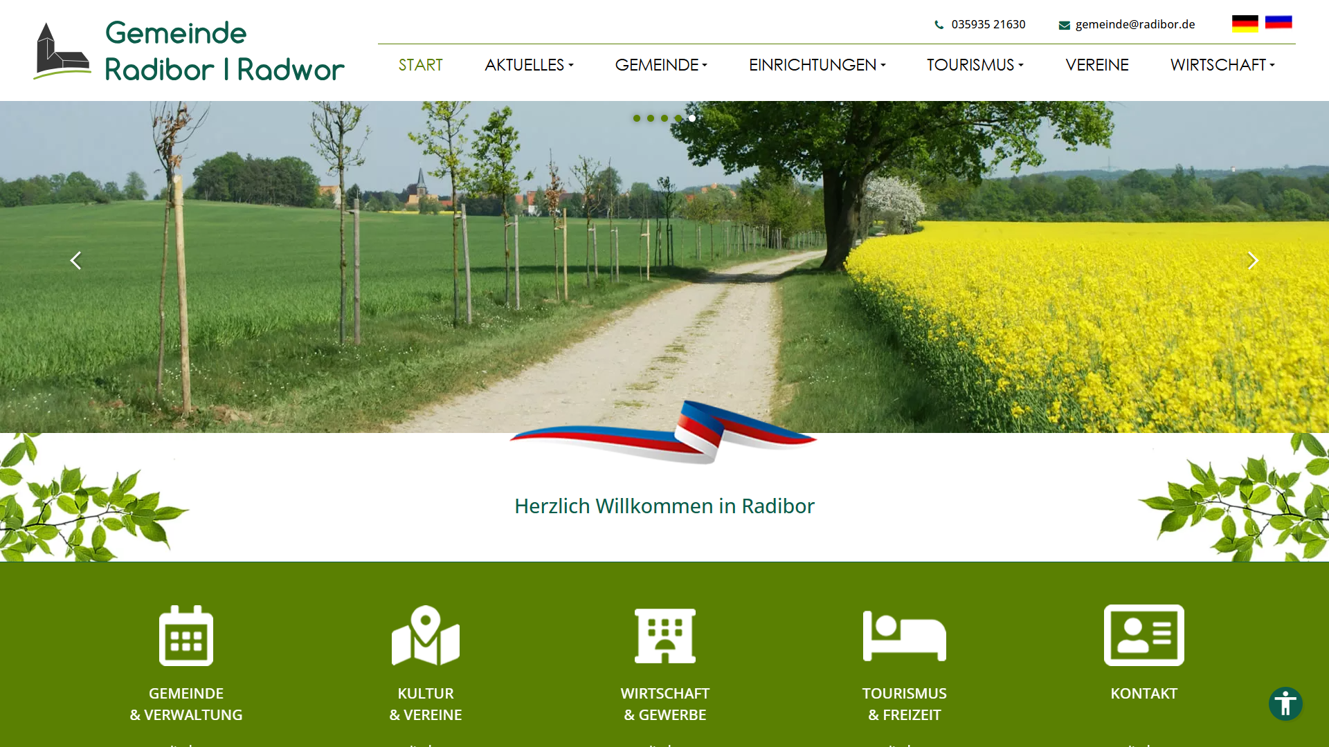Für die Gemeinde Radibor wurde eine mehrsprachige, barrierearme und benutzerfreundliche Website umgesetzt. Die kommunale Online-Präsenz ermöglicht der Verwaltung eine einfache Pflege von Inhalten sowie eine strukturierte Bereitstellung von den 24 Ortsteile, Amtsblättern und Formularen für Bürgerinnen und Bürger. Dadurch wird die digitale Kommunikation zwischen Gemeinde und Einwohnern deutlich verbessert.
