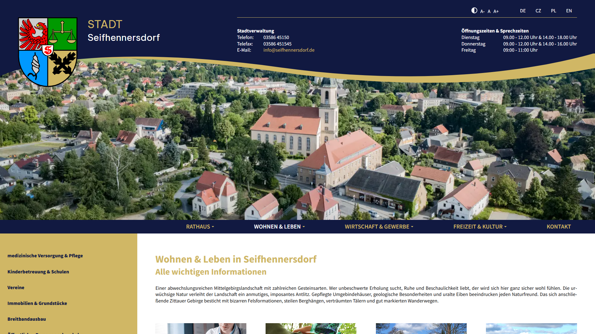 Für die Stadt Seifhennersdorf wurde ein modernes Redaktionssystem auf Basis von Contao CMS umgesetzt. Die Website wurde inhaltlich neu strukturiert und klar gegliedert, sodass Bürgerinnen und Bürger wichtige Informationen, Bekanntmachungen und Amtsblätter schnell finden können. Ein zentrales Archiv sorgt für eine übersichtliche und transparente Bereitstellung aller Inhalte. Durch individuell entwickelte Inhaltselemente ist die Pflege der Website einfach und intuitiv. Die Einarbeitung erfolgt in kurzer Zeit, eine Schulung ist als Inklusivleistung von MyArtSide enthalten. Zusätzlich wurde ein Veranstaltungskalender über eine Schnittstelle integriert, der externe Veranstaltungen automatisch einbindet und zentral darstellt.